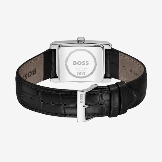 The BOSS Principle Dress Watch combines classic design with modern elegance. Featuring a 28x39mm stainless steel case, it showcases a sleek black dial accented by silver Roman numerals, baton hour markers, and refined silver hands. The black leather strap adds a timeless touch, making it ideal for both formal occasions and everyday business wear. Understated yet sophisticated, this watch is a perfect accessory for the modern gentleman.