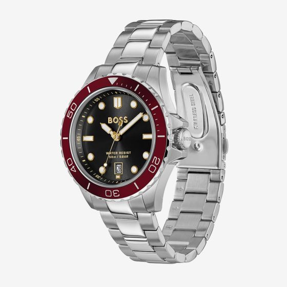 Bold and athletic, the BOSS Troper Sport is built for performance and presence. Featuring a stainless steel case and bracelet, this dynamic timepiece is highlighted by a striking red bezel and a contrasting black dial. Luminous hands and hour markers ensure visibility in any light, blending style with functionality. Designed for the modern man with an active lifestyle, this watch delivers confidence and precision.