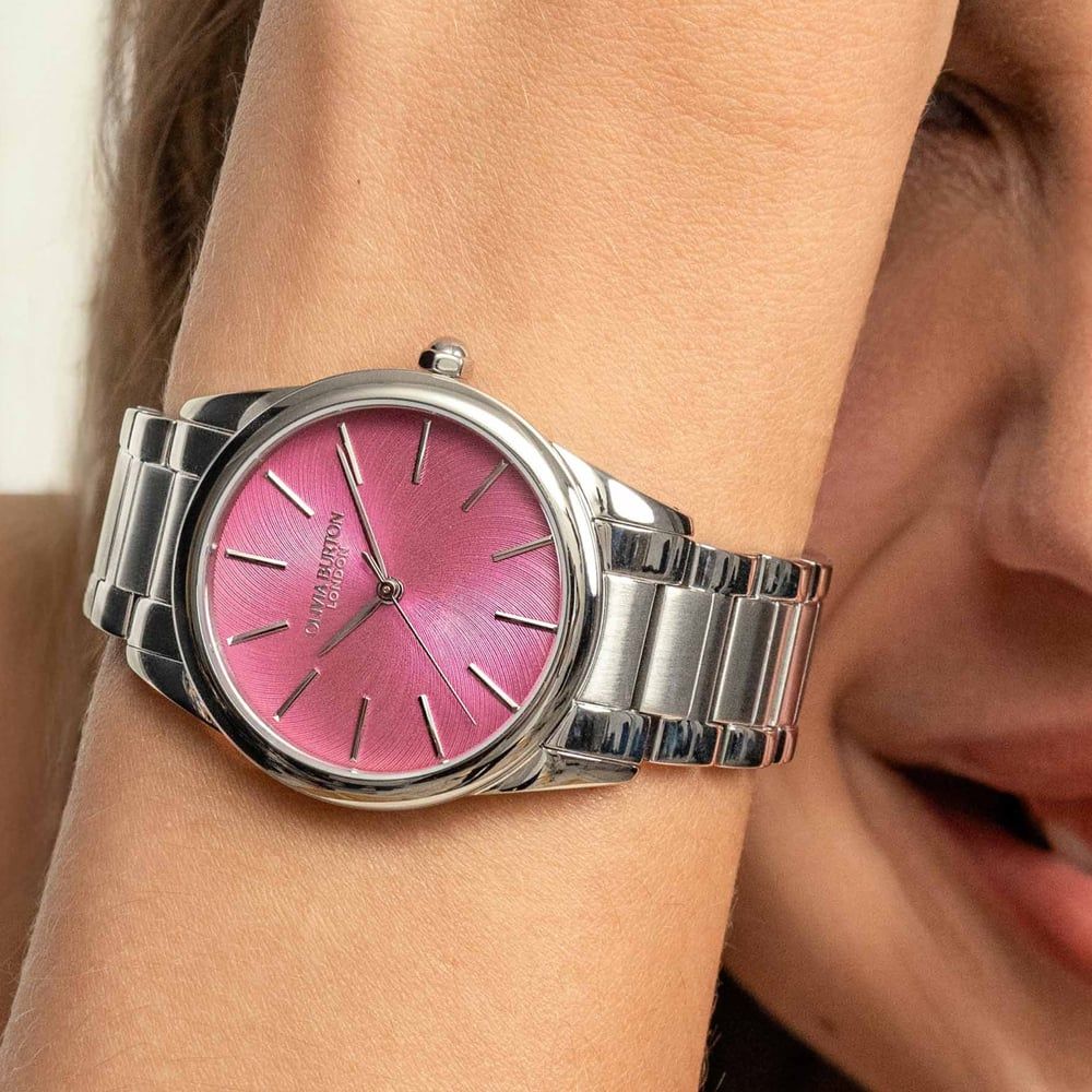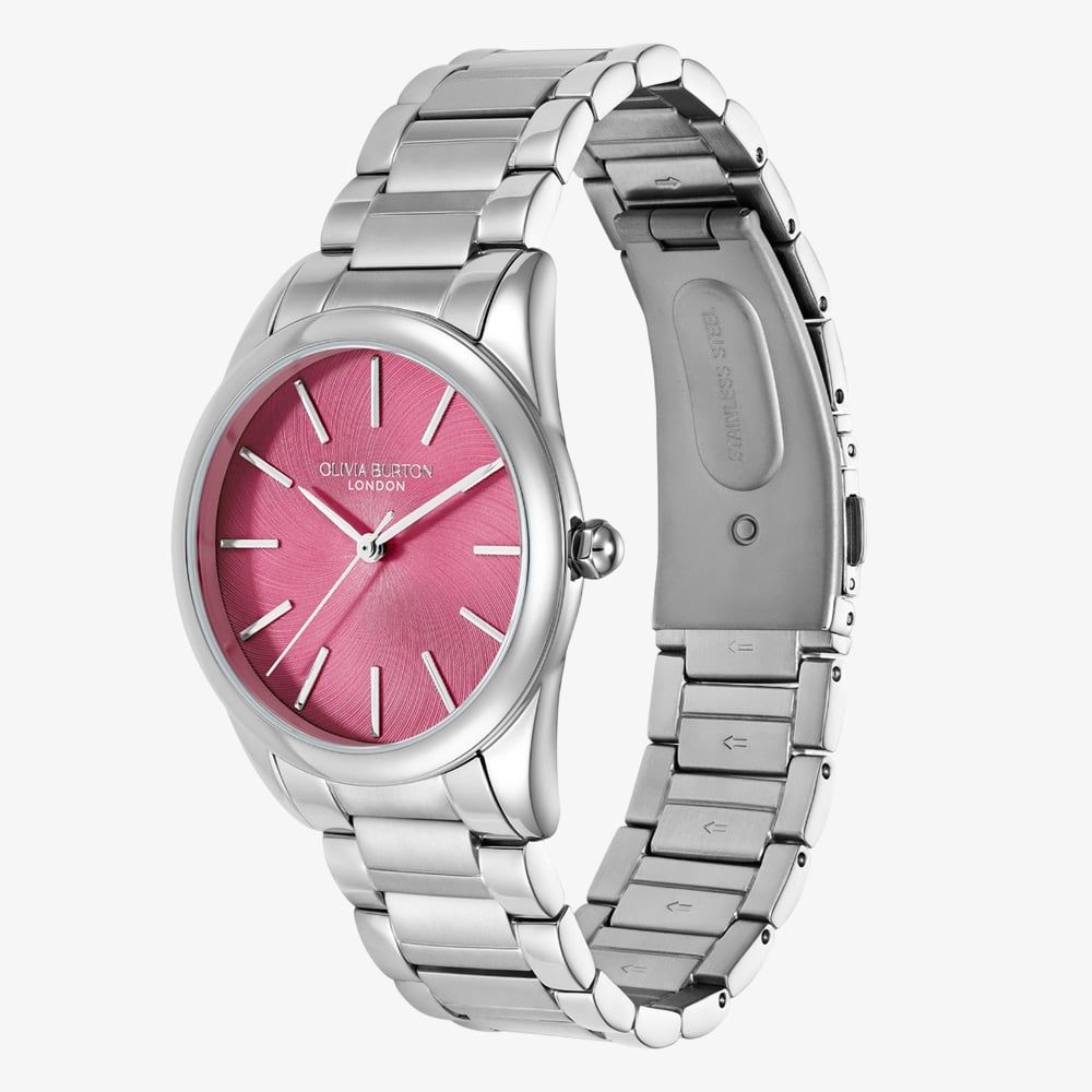 A beautiful blend of elegance and modern charm. Featuring a stunning pink dial with a radiant finish, this timepiece adds a touch of sophistication to any look. featuring a polished stainless steel case and paired with a sleek bracelet, this watch exudes timeless appeal with a contemporary twist. Perfect for both everyday wear and special occasions.