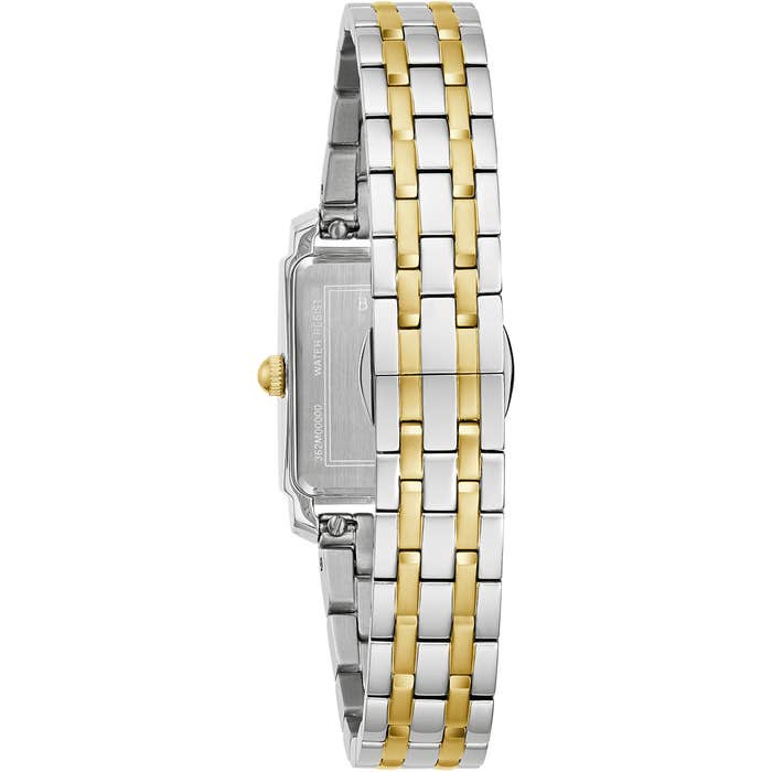 This Bulova ladies timepiece brings new style to the already sophisticated Sutton Collection. An elegant two-tone stainless rectangular steel case is paired with a matching bracelet. The lustrous mother-of-pearl dial is accented with gold-tone hour markers and matching hands, including three diamond markers, for a look of true sophistication. This Bulova ladies timepiece is perfectly styled for the woman who is ready to make a statement.