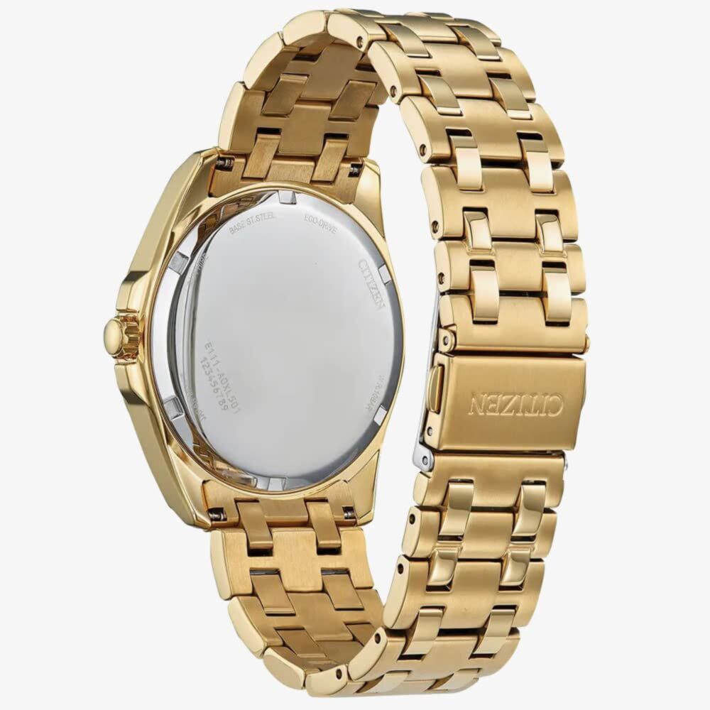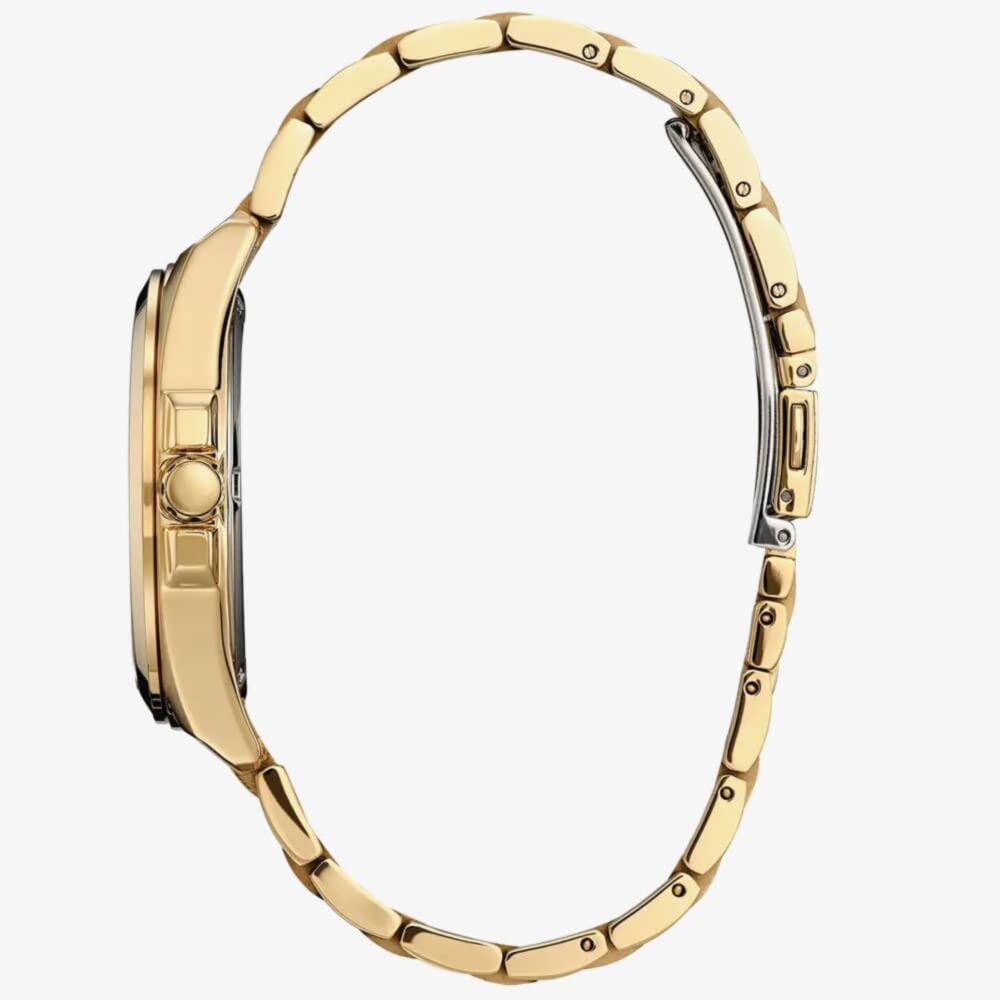 Crafted in gold-tone stainless steel, this watch effortlessly enhances any ensemble. The Eco-Drive technology keeps it powered sustainably by any light source. • Powered by the Eco-Drive movement, which harnesses light from both natural and artificial sources.. • Presented on a stainless steel bracelet with fold over clasp. • Scratch resistant sapphire crystal glass. • 41mm case width. • 100 metre water resistance.