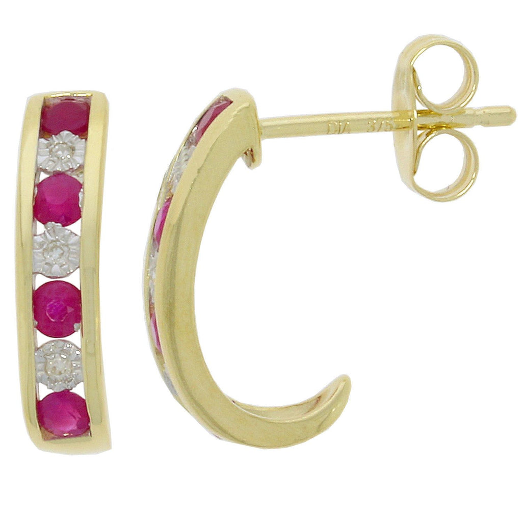9ct Yellow Gold Channel Set Ruby & 0.03ct Diamond Half Hoops