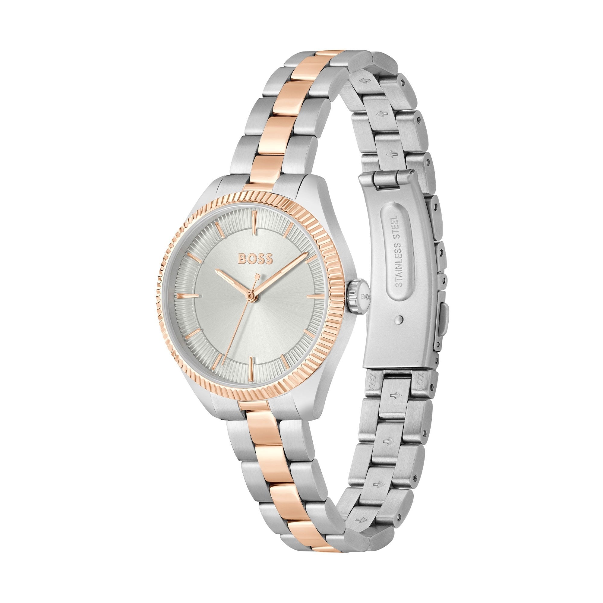 - Silver dial with rose gold tone stainless steel hands and hour markers