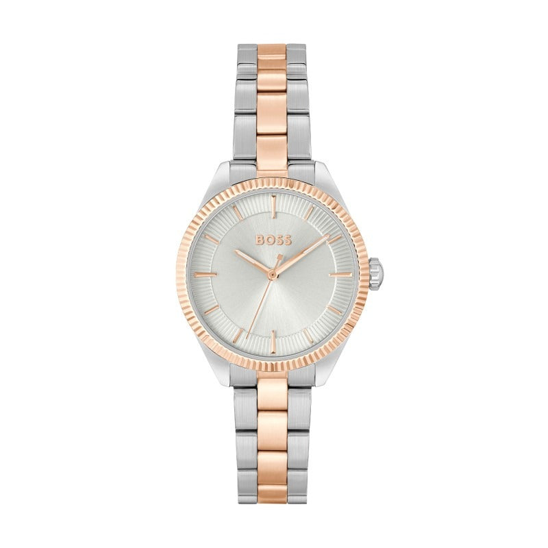 The perfect touch of elegance and designer luxury, this BOSS Sage 32mm Stainless Steel and Rose Gold Tone Ladies Watch showcases a stylish charm that will elevate every look.