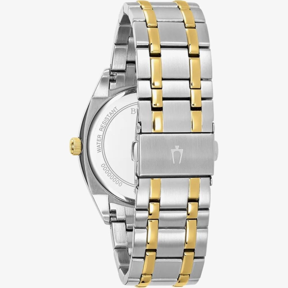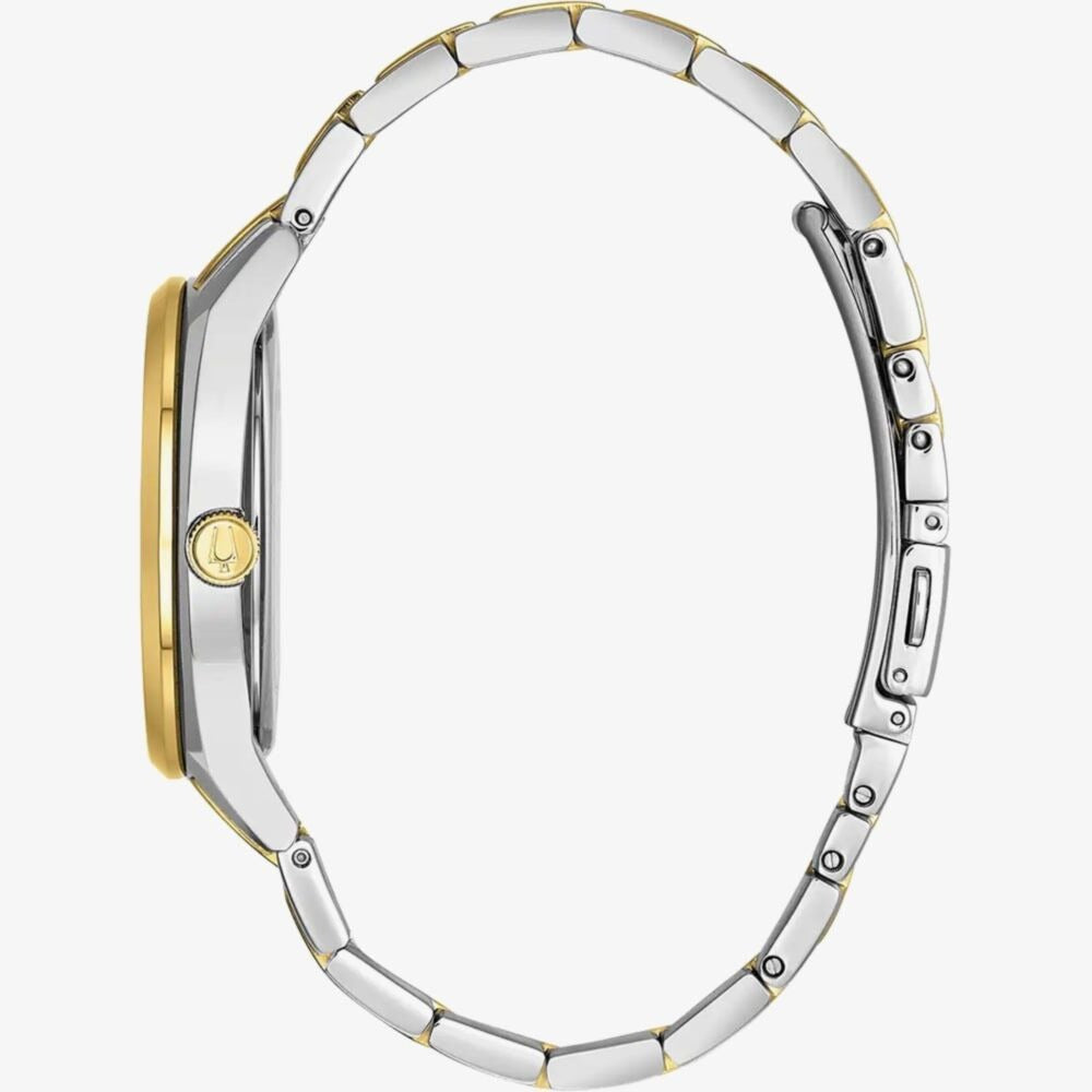 The Bulova Men’s Surveyor stands out with its refined design and superior craftsmanship. It features a two-tone stainless steel case, a silver-white dial with gold-tone hands and markers, and a new three-hand day/date function. A domed mineral crystal adds a classic touch, while the matching gold-tone and stainless steel bracelet with a short fold-over double-push closure completes the elegant look.