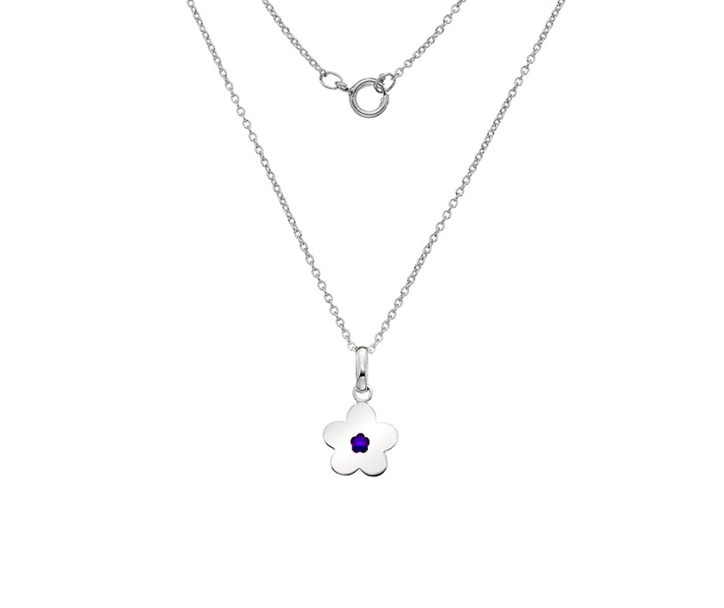 This sterling silver necklace features a flower shaped pendant with purple enamel centre. Matching earrings available.