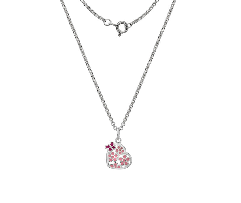 This sterling silver necklace features a heart shaped pendant with enamel flowers and butterfly. Necklace length: 14".