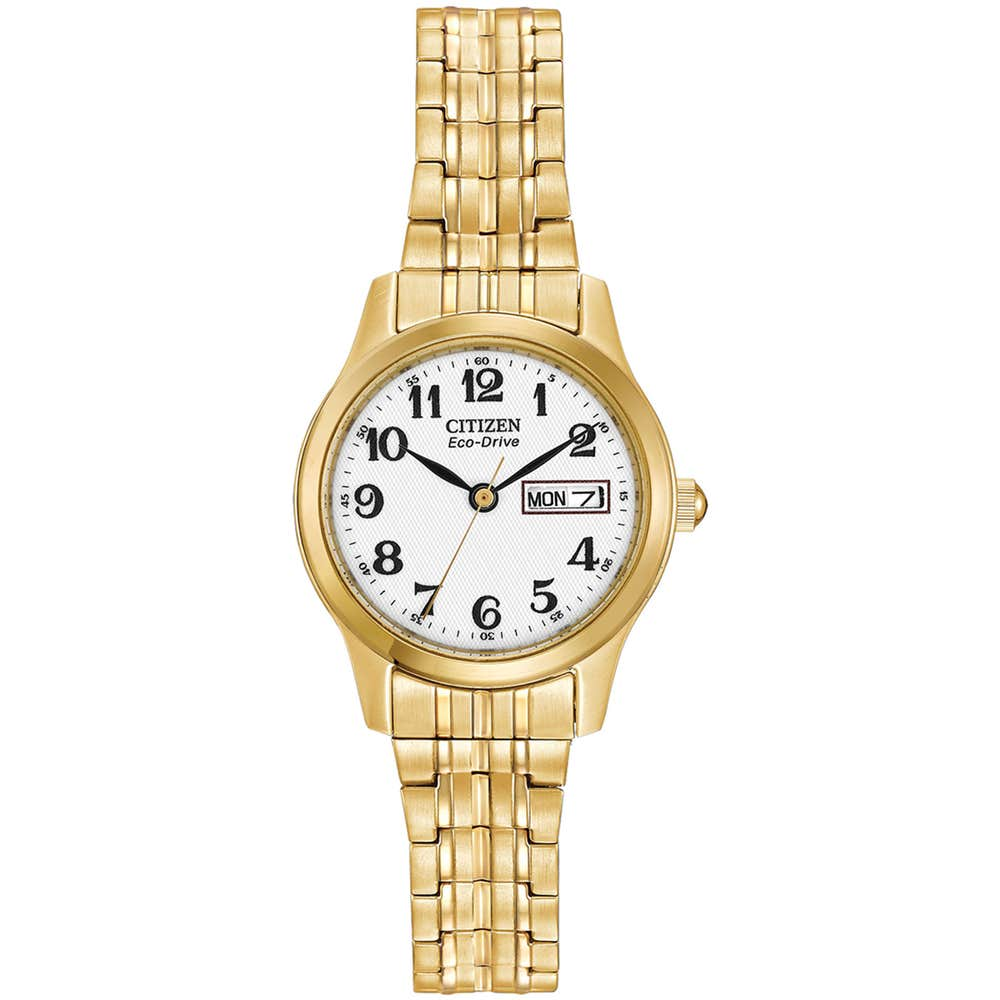 Design and comfort unite in the Citizen Eco-Drive Expansion collection, offering timepieces with universal appeal. Key features of this 3-hand analogue watch in gold-tone stainless steel include day-date indicator, white dial, 25mm case and 30 metre water resistance. Featuring Eco-Drive technology powered by light, any light. Never needs a battery.