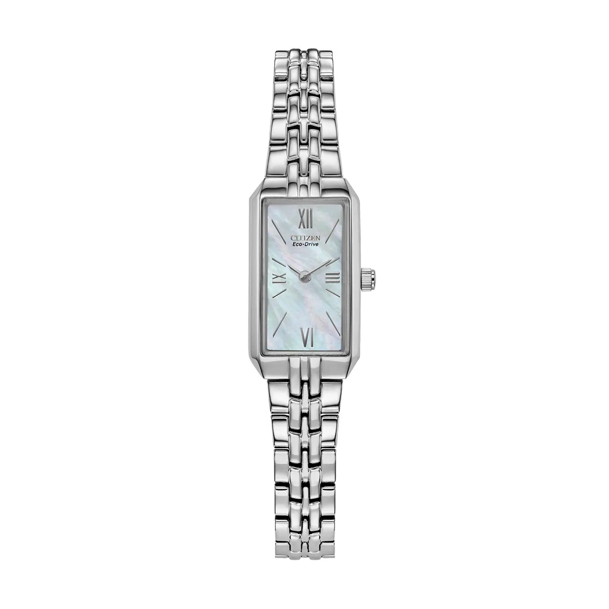 Perfectly complete any look with the elegance of this Silhouette from Citizen. With a stainless-steel 26mm case paired with a stainless-steel bracelet, this watch fits seamlessly on the wrist. The look is completed with a beautiful Mother-of-Pearl dial and silver-tone hands and markers. Additional features include water resistance and a jewellery clasp with push button release. Sustainably powered by any light with Citizen Eco-Drive technology - never needs a battery.