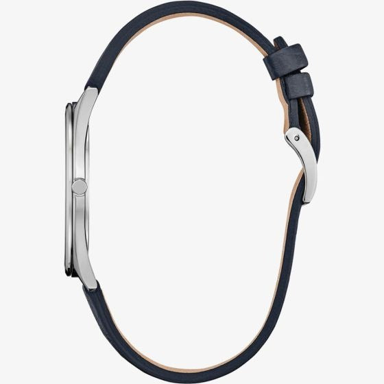 Classic lines and a simple silhouette define the sleek Stiletto. This all-purpose dress watch features a versatile silver-tone stainless steel 38mm case, a two-hand blue dial featuring an entrancing metallic powder aesthetic with silver-tone hands and markers, and is secured to the wrist via a grained blue leather strap with buckle closure. Sustainably powered by any light with Eco-Drive technology and never needs a battery. Water resistant to 50 metres.