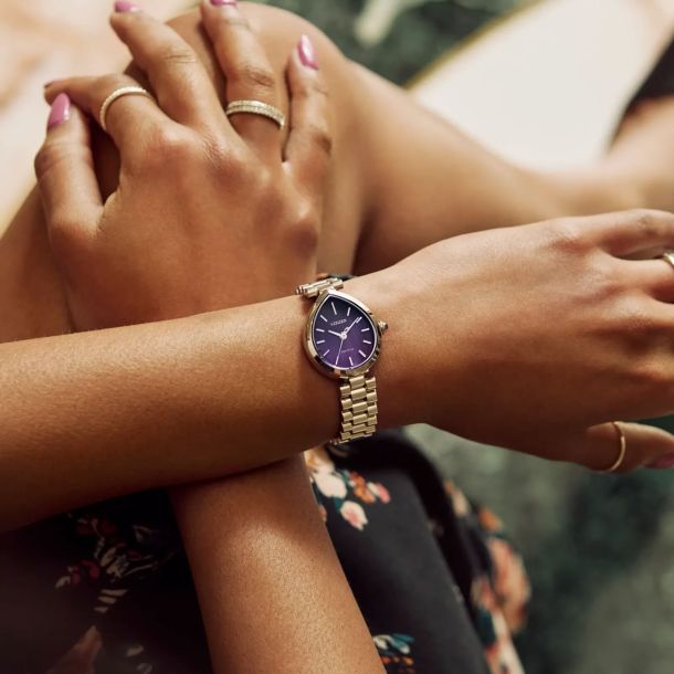 Flirty and feminine, the new Citizen L Rainell is a watch as creative and elegant as those who wear it. With subtle dimensions of 26mm by 31mm, the signature shape of the timepiece speaks for itself in understated silver-tone stainless steel. An integrated bracelet and synthetic sapphire-set crown punctuate the look. A lovely purple dial follows the shape of the case, with a brushed background playing host to refined details in applied indices and matching hands. Sustainably powered by any light with our proprietary Eco-Drive technology that never needs a battery. Water resistant up to 50 meters. Caliber E031.
