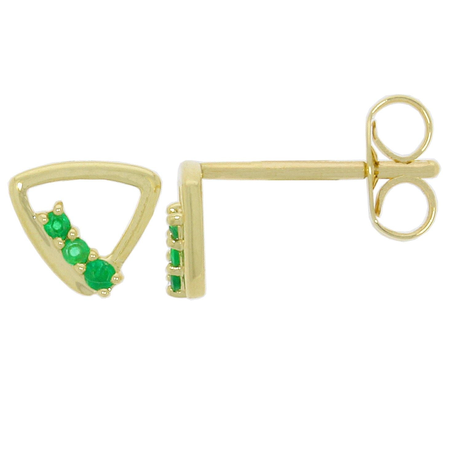 A pair of 9ct yellow gold stud earrings with an open triangle design, each inlaid with three round brilliant cut emeralds in four claws. Secured with post and scroll closure.