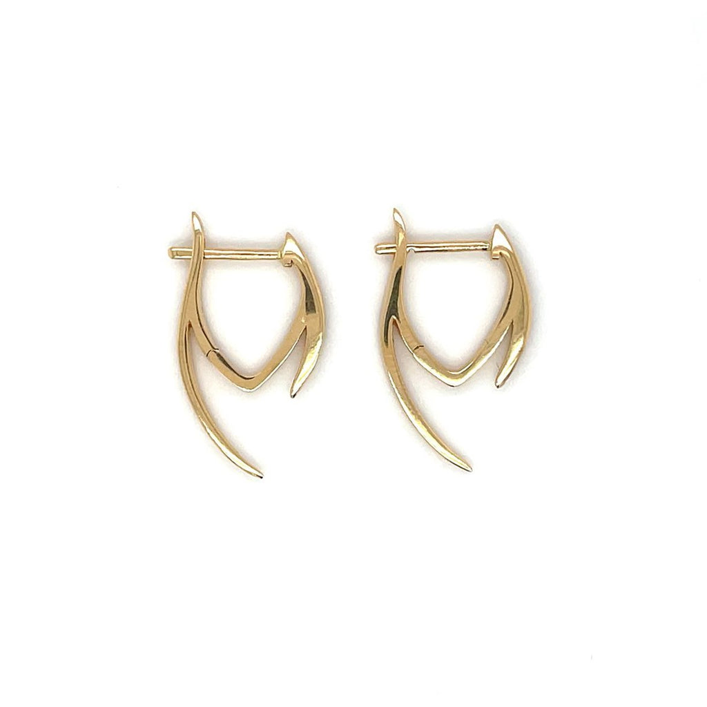 These unique earrings are crafted in 18ct yellow gold, and feature a hinge closure and a smooth organic shaped spike design. The front-facing drop is inlaid with diamonds. Earring drop: 2cm.