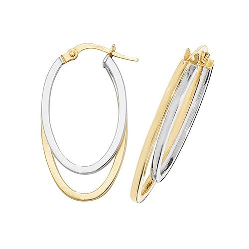 A pair of 9ct yellow and white gold oval hoops with a hinge opening.