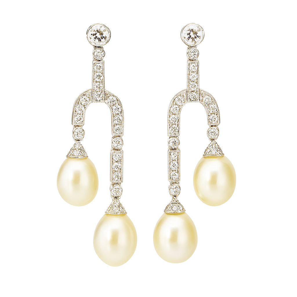 These sparkling earrings are crafted from 18ct white gold, and have a unique curved double drop design, inspired by deco style. Each features two pearls and claw set diamonds, ensuring sparkle at every angle. Secured with scroll and post. Earring drop: 4cm.