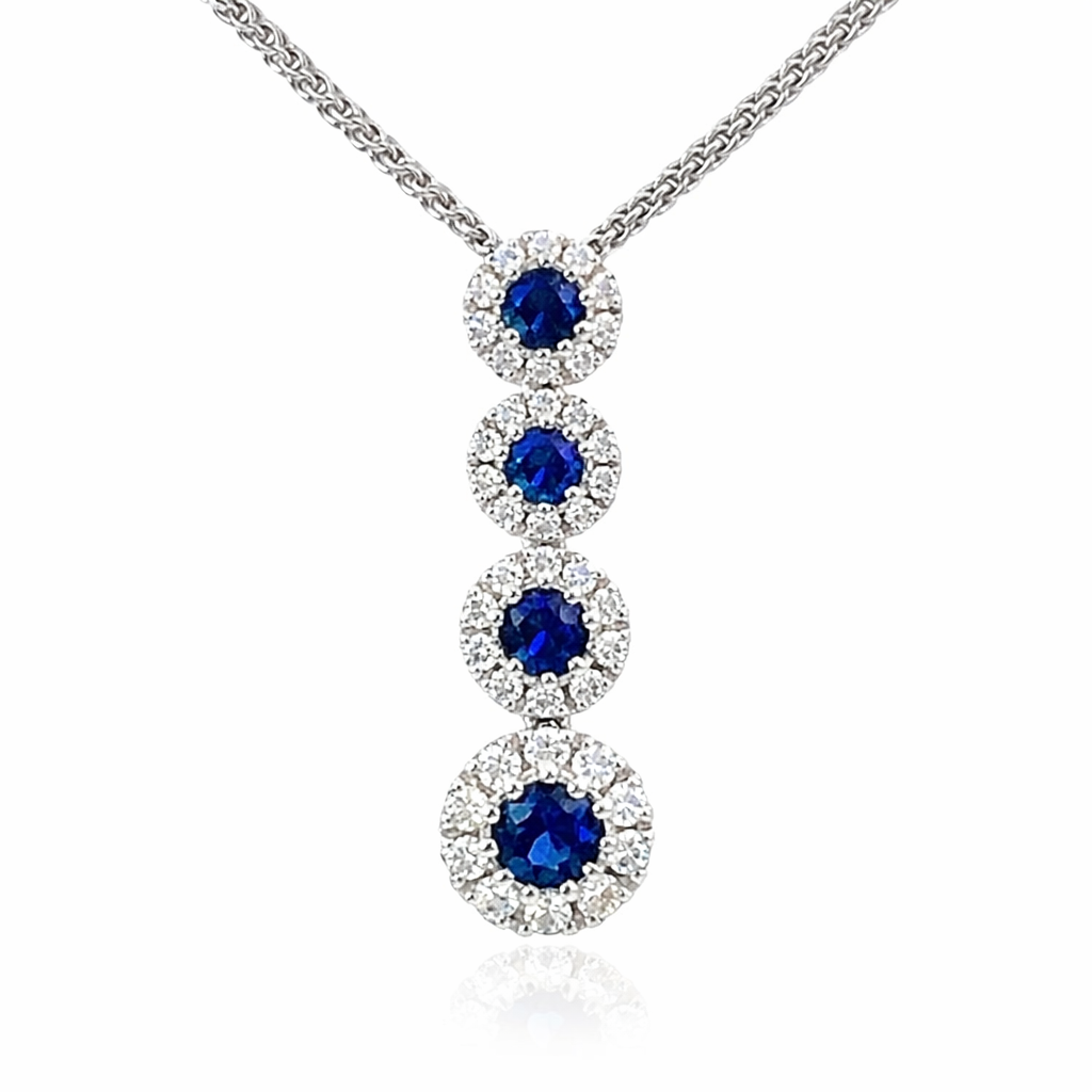 An 18ct white gold pendant featuring four round brilliant cut sapphires totalling 0.43ct, with diamond haloes totalling 0.26ct.