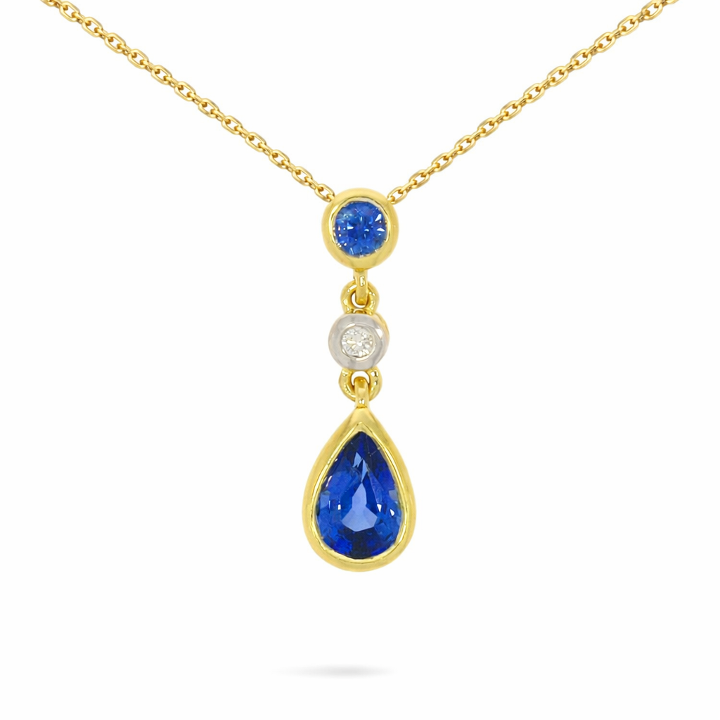 A 9ct yellow gold pendant with a central round brilliant cut 0.02ct diamond, with a pear cut sapphire below and round brilliant cut sapphire above totalling 0.70ct.