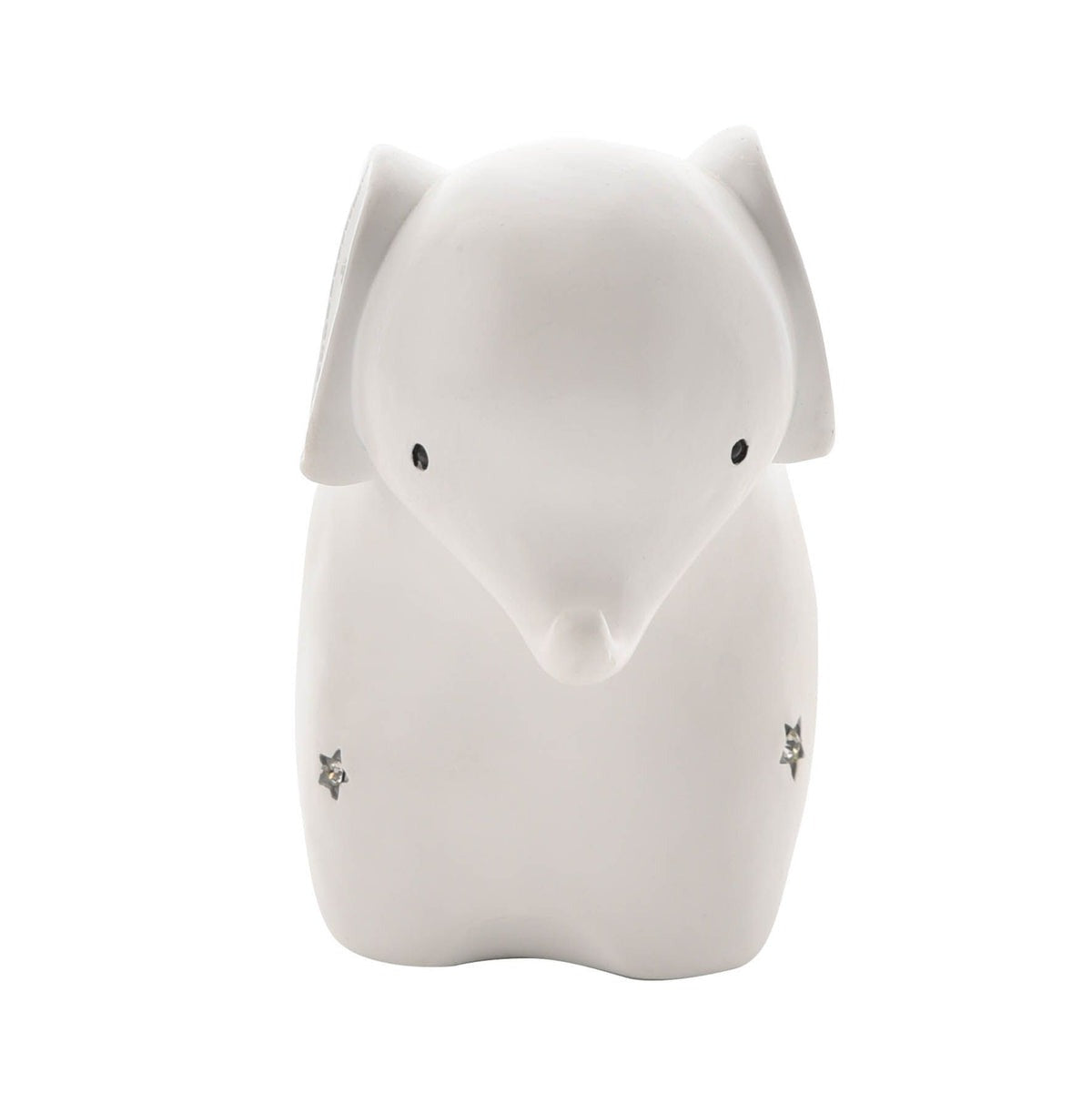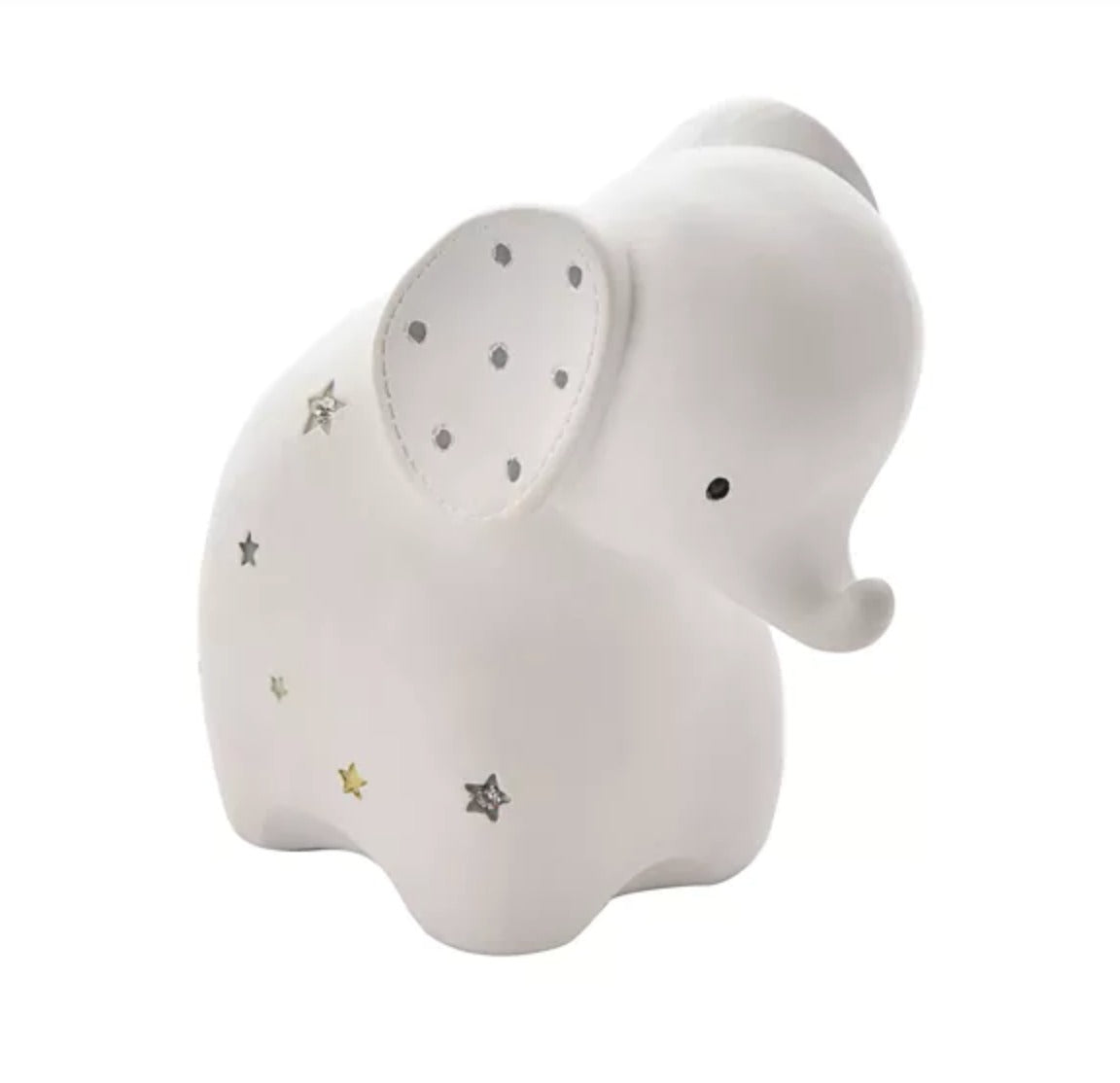 An elephant shaped resin money box from BAMBINO BY JULIANA. This wonderful keepsake provides beautiful decoration for the nursery of new family arrivals which will be cherished eternally. The crisp white money box features a matt finish, complete with clear set crystal details and soft grey star decoration. It is completed by a large money slot on the rear for saving coins and an easy-to-remove rubber bung on the base. The money box is packaged in a branded closed box.