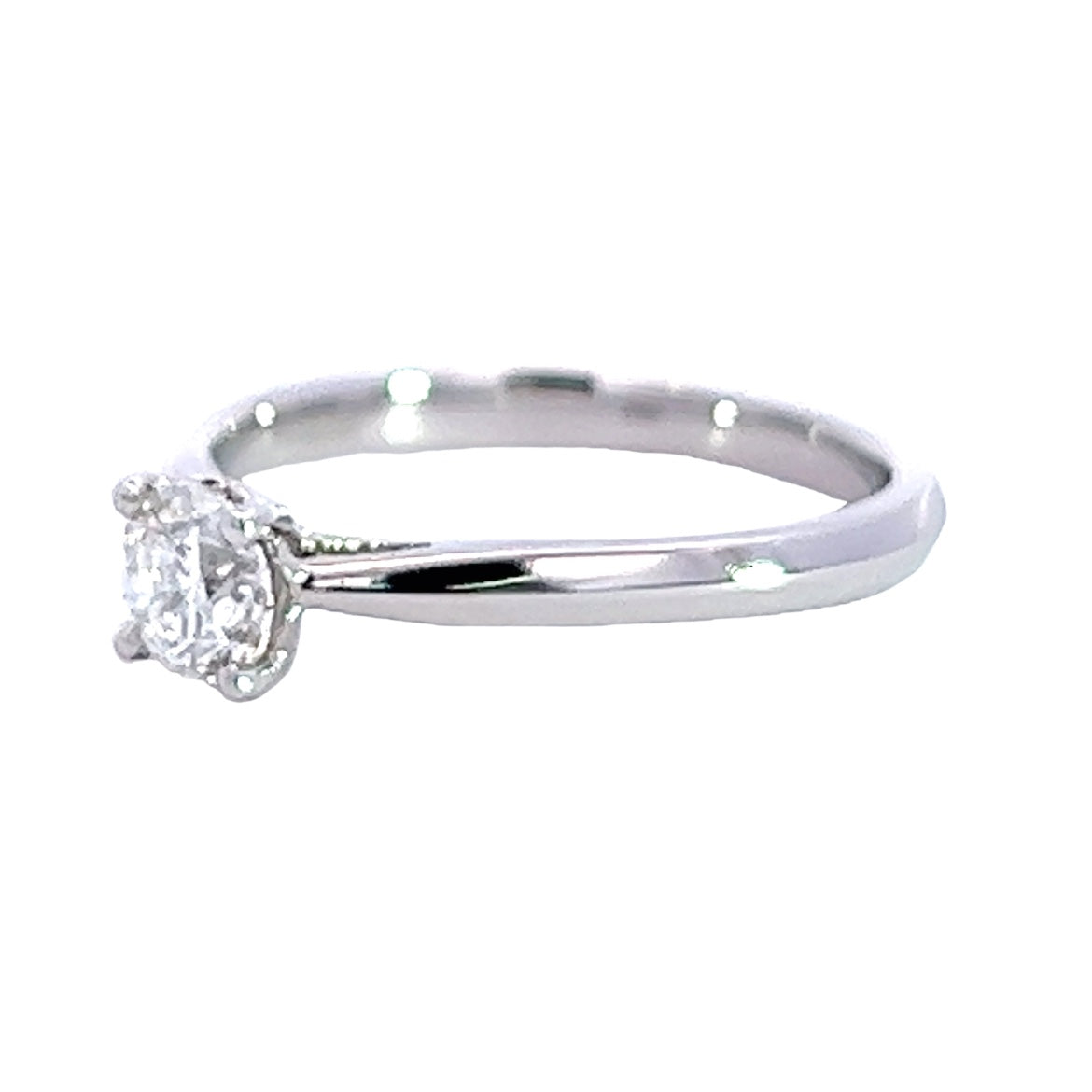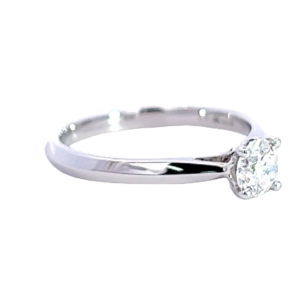 This alluring platinum solitaire ring features a 0.50 carat certified round brilliant cut diamond set in the modern platinum 4-claw setting. The clarity rating of this unique stone is SI2 - slight inclusions and the H grade for colour means the stone is near colourless and has a very desirable level of whiteness.