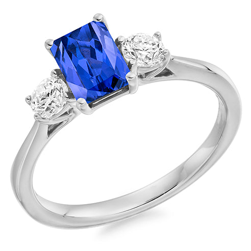 This platinum trilogy ring features a 1.10ct emerald cut tanzanite (7.00 x 5.00mm) at the centre, flanked by two round brilliant cut diamonds totalling 0.33ct. All stones are securely set in four claws. With a total carat weight of 1.43ct, this ring combines the striking purple - blue hue of the tanzanite with the brilliance of diamonds, creating a sophisticated and timeless design. The ring is size M.