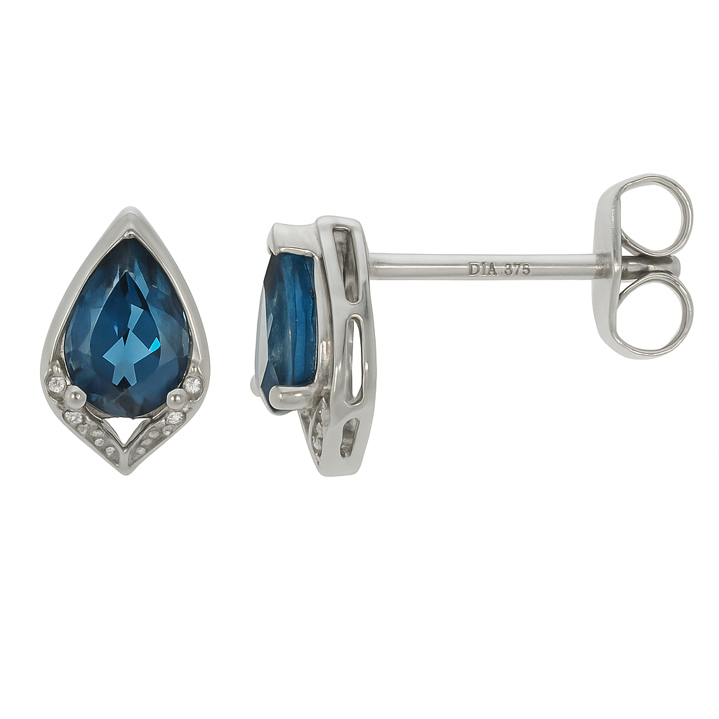 9ct White Gold Pear Cut London Blue Topaz & 0.01ct Diamond Studs