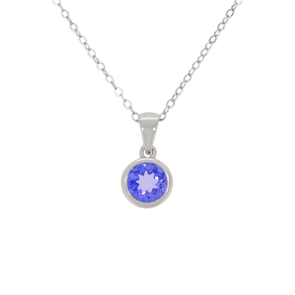 A 9ct white gold pendant with a round brilliant cut tanzanite in a bezel setting.