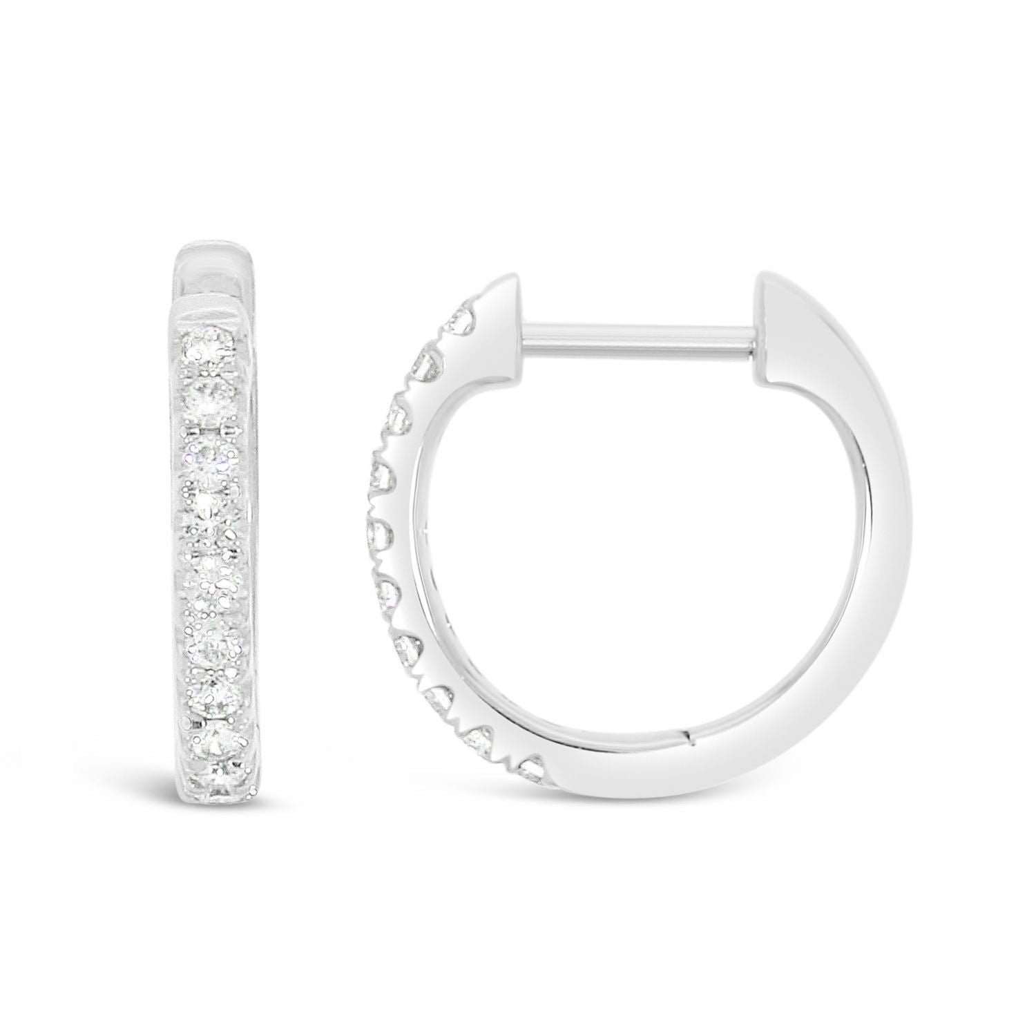 These 9ct white gold hoops are designed to hug the earlobe, and have a hinge opening for easy wear. Each earring is inlaid with round brilliant cut diamonds, totalling 0.20ct.