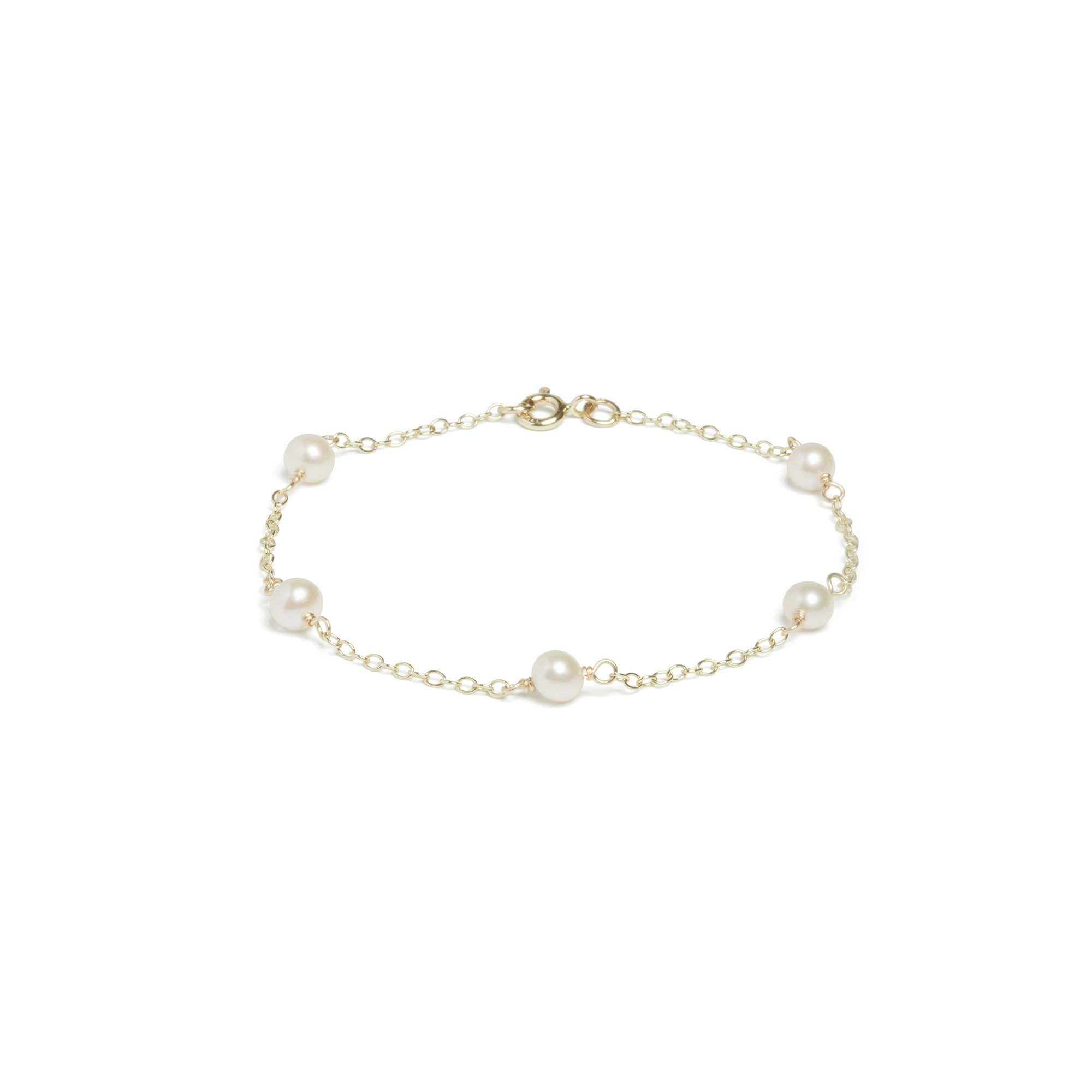 This beautiful bracelet is formed of a delicate 9ct yellow gold chain, and 5mm-5.5mm cultured river pearls. Secured with a 9ct yellow gold clasp.