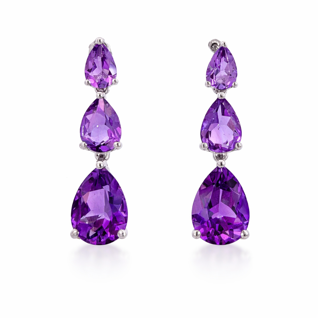 Crafted in 9ct white gold, this pair of earrings feature pear cut amethysts graduating in size and colour.