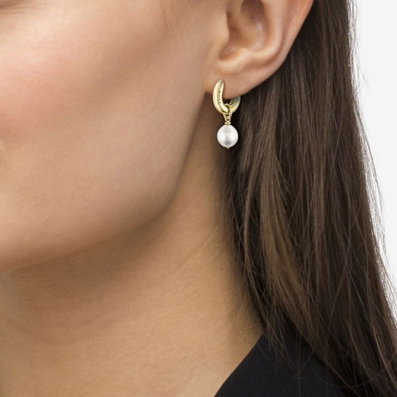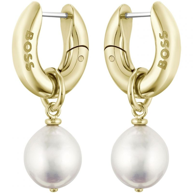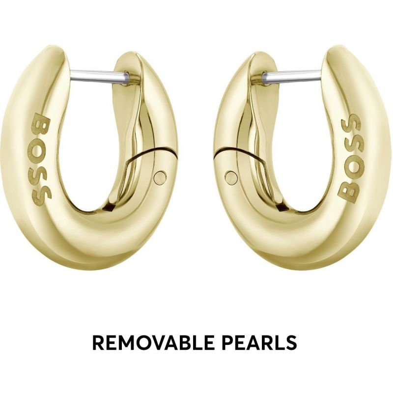 BOSS Ladies light yellow gold IP earrings from the Leah collection. Features removable Freshwater Pearls and hinged hoop closure.
