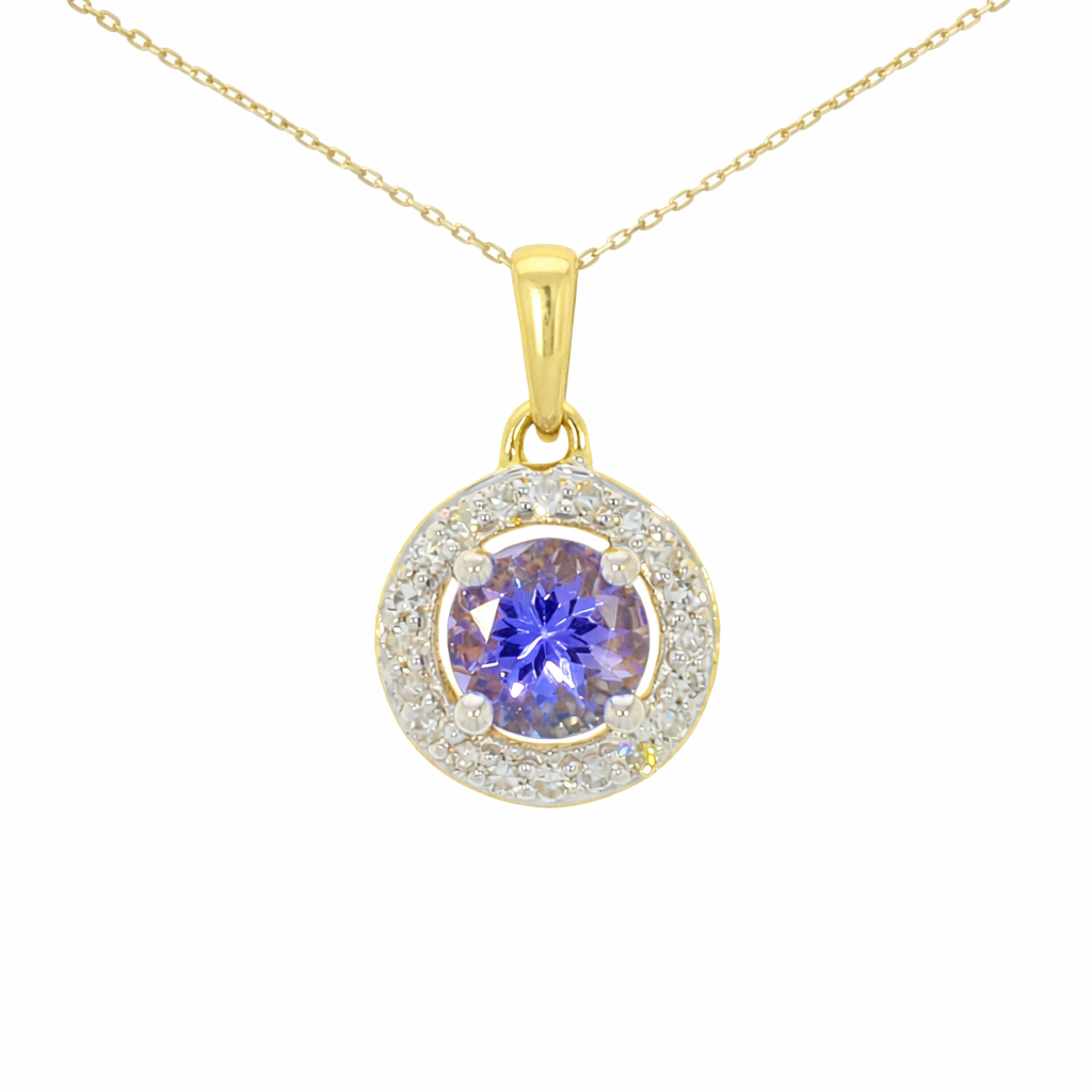 Set in 9ct yellow gold, this beautiful necklace features a round shaped tanzanite stone surrounded by white round brilliant cut diamonds.