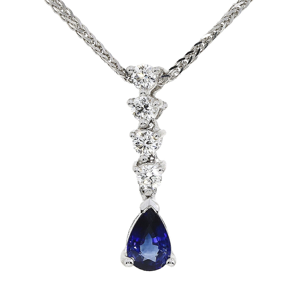 This beautiful pendant features four round brilliant cut diamonds descending to a 0.48ct pear cut sapphire in a three claw setting.