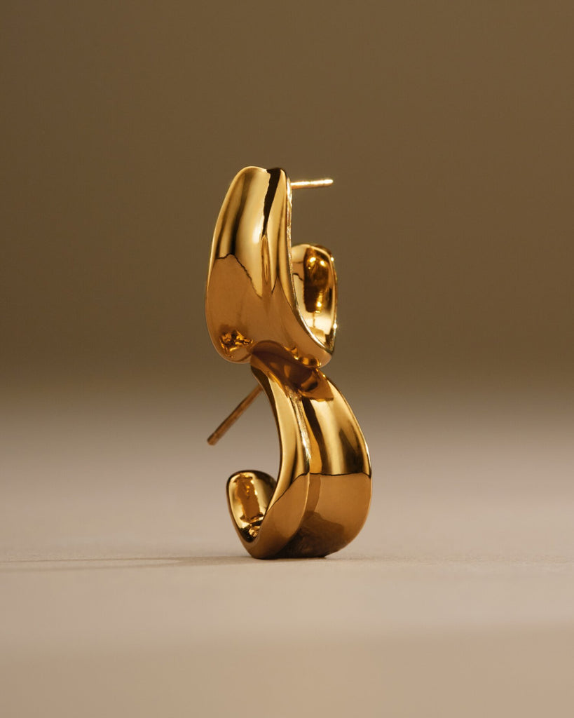 Our Molten Luxe Hoop Earrings are made from durable 18K Gold PVD coating, making them certified waterproof, sweat-proof, and life-proof. Featuring a molten metal, statement-making design, they stand out solo or pair beautifully with the matching bangle and ring. Presented in a reusable suedette pouch, they're ideal for gifting or taking with you on the go.