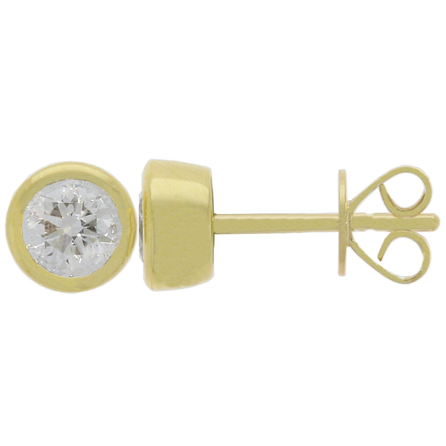 These simple 9ct yellow gold studs feature round brilliant diamonds in a bezel setting, with a total carat weight of 0.80ct. Lab grown diamonds are identical to natural mined diamonds in both appearance and structure.
