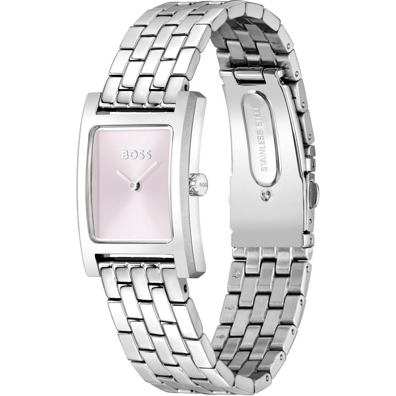 BOSS ladies two hand watch from the Lucy family. Featuring a 22x24.5mm stainless steel case, sunray pink dial and stainless steel bracelet. Water resistant to 3 ATM