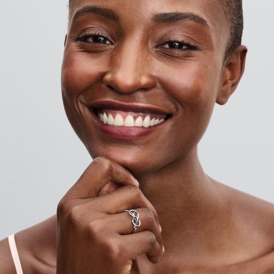 Bring a symbol of the infinite into the everyday with the Infinity Knot Ring. Hand-finished in sterling silver, this ring centres on an infinity knot symbol featuring a sparkling stone at each end.