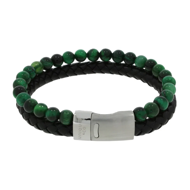 Unique & Co 2 row men's bracelet features green Tigers Eye beads and black woven leather with a brushed stainless steel snap clasp featuring the 'Unique' branded logo.