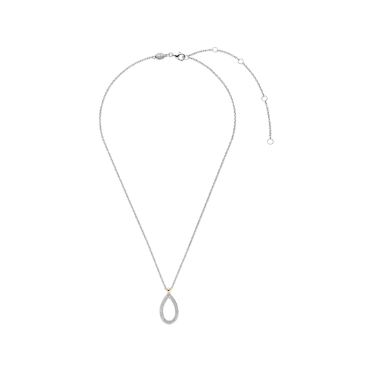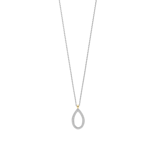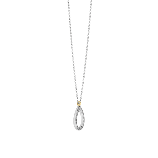 Celebrate refined simplicity with this TI SENTO gold-plated silver Necklace 34110ZY. A sleek teardrop silhouette, outlined in a halo of hand-set white cubic zirconia, catches the light with every movement. The warm yellow gold-plated bail adds a gentle contrast, elevating the pendant’s elegant curves. Crafted from premium 925 sterling silver and finished with platinum plating for lasting brilliance, this necklace is a sophisticated essential in any jewellery wardrobe. The open teardrop design evokes softness and flow, making it a subtle statement of grace and femininity. Perfect for layering with fine chains or wearing solo, this necklace transitions effortlessly from casual elegance to formal chic. Style it with matching earrings or stack it with other TI SENTO necklaces for a curated look. Nickel-free and hypoallergenic, it offers luxurious comfort for everyday wear.