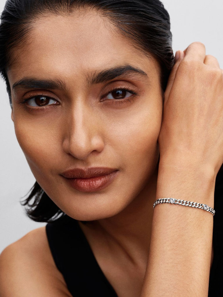 Celebrate love with our sterling silver Cuban bracelet chain. Featuring heart-shaped stones set in intervals along the bracelet, wear it as a timeless symbol of affection and elegance.
