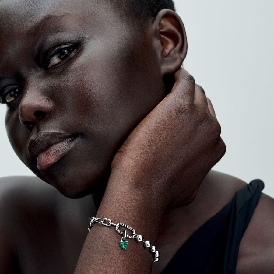 Love has no limits when you wear the Pandora ME Green Chakra Heart Mini Dangle Charm. This sterling silver heart charm features green enamel and a green heart-shaped man-made crystal at centre. The reverse side features grooved lines and cut-out detailing. A reminder that wild hearts can't be broken, this mini dangle charm brings a depth to your look, symbolising that love  for yourself and others  always wins. Compatible with Pandora ME and Pandora Moments.