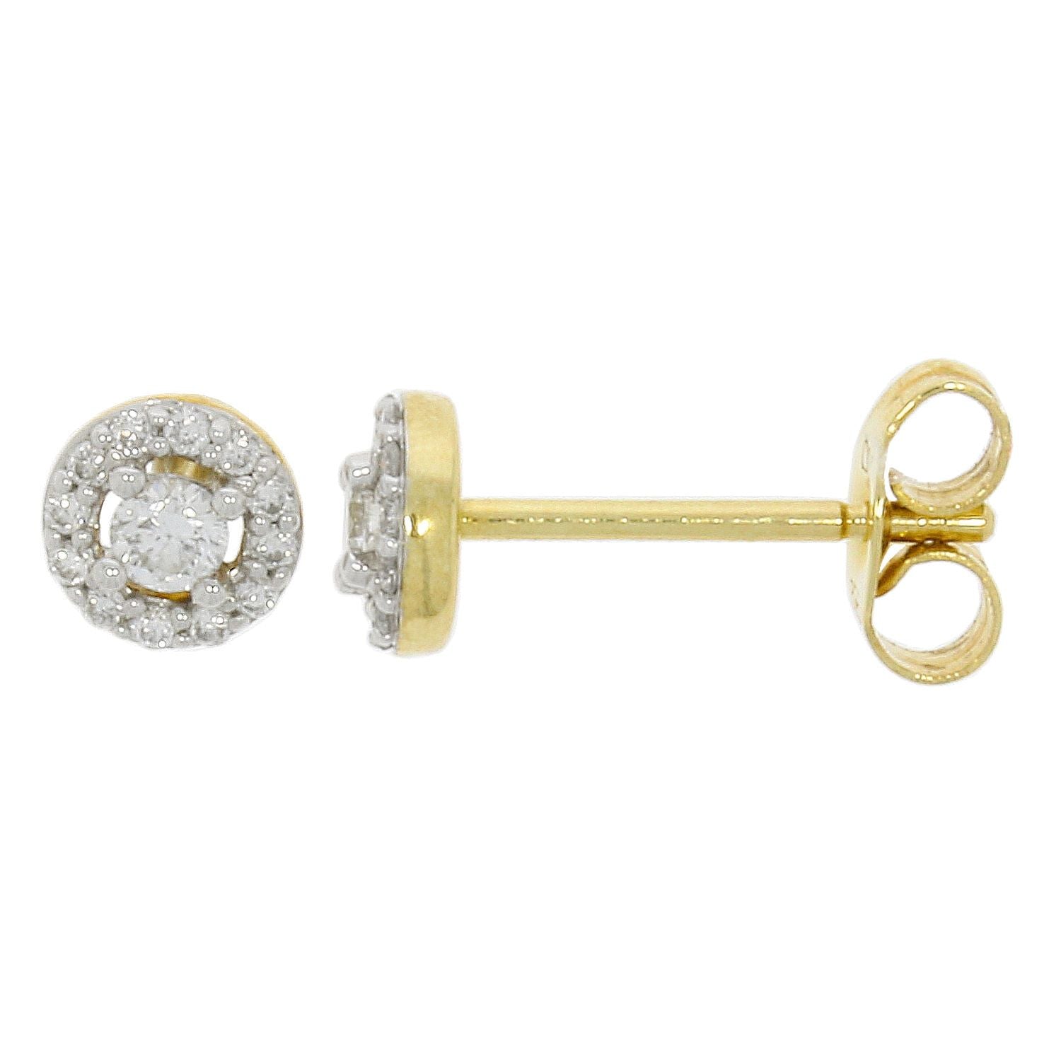 9ct yellow gold cluster diamond earrings, set with one round brilliant cut central diamond in flour claws, surrounded by a halo of round brilliant cut diamonds. 0.20ct total diamond weight.