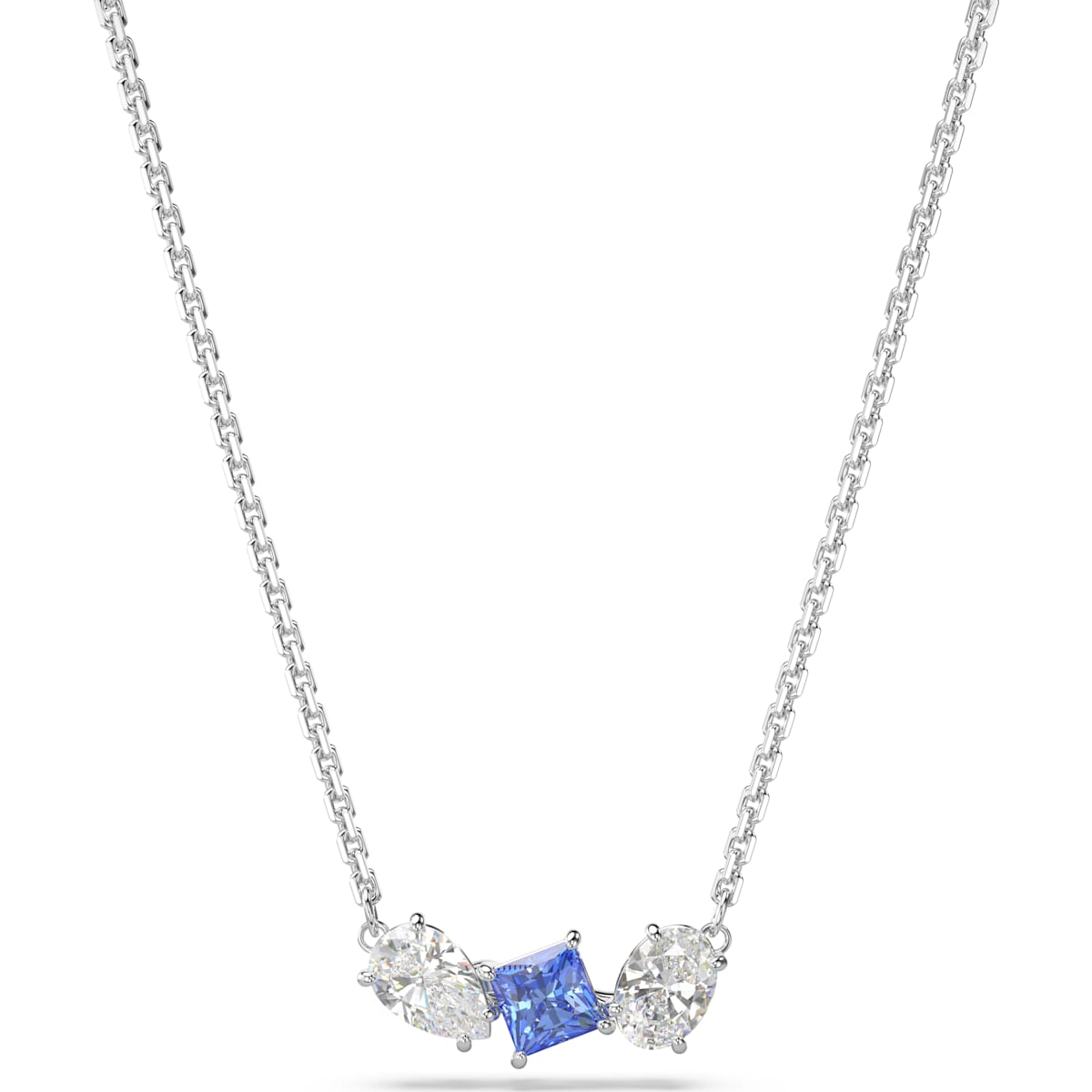 This elegant Mesmera pendant delivers exquisite refinement through its bold mix of cuts and colour. Worn on a delicate chain, the rhodium plated design features a trio of prong-set Swarovski Zirconia in varying shapes with a radiant blue central stone. A wondrous gift that will accentuate any style.