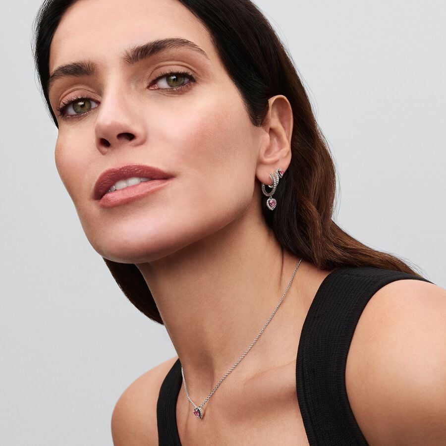 Made of sterling silver, this collier necklace centres on one heart-shaped sparkling pink stone pendant. The centre stone, which is raised, is surrounded by pavé. The chain's length is adjustable and allows the pendant to slide along it, but the pendant does not detach.