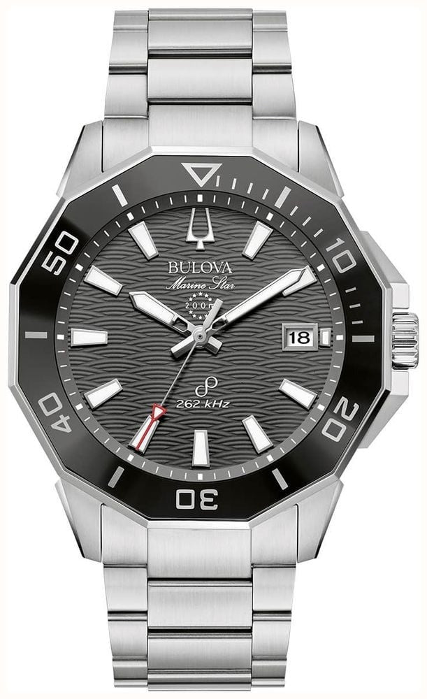 An incredibly bold design, this men’s Bulova Marine Star sports watch pushes the limits with Bulova’s cutting edge technology and a strikingly modern case. Defined by a rugged, angular profile, the 43mm stainless steel case features brushed facets and polished accents, with a unidirectional timing bezel with a ceramic insert, sapphire crystal, and a screw-down crown ensuring 200m water resistance. The grey dial takes its inspiration from the undulating crests of the ocean, with a wave pattern accented by applied hour markers and a bold handset, all featuring luminescent material for unrivalled legibility in all conditions. A date window is positioned at 3 o’clock, while the red-tipped seconds hand brings a subtle pop of colour and sweeps smoothly around the dial thanks to Bulova’s proprietary Precisionist movement, a revolutionary 8-jewel quartz mechanism vibrating at a remarkable 262kHz and accurate to 10 seconds per year with increased resistance to temperature changes. Paired with a stainless steel bracelet, this men’s Bulova timepiece is equipped to handle everything from the office to the ocean.
