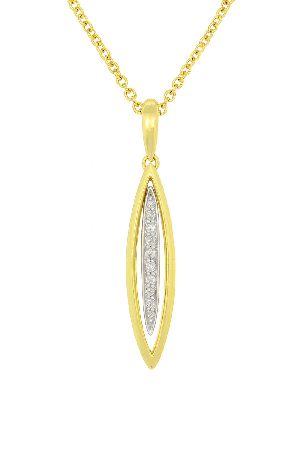 A 9ct yellow gold pendant with an elongated open design, and an additional free-hanging 9ct white gold section in laid with 0.06ct diamonds.