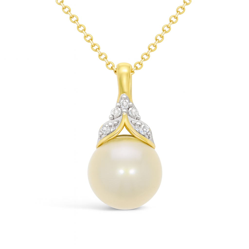 This 9ct yellow gold pendant features a dazzling freshwater cultured pearl, crowned with 0.04ct diamond stones set in white gold. This pendant can be hung on any chain of your choosing. Matching earrings available.
