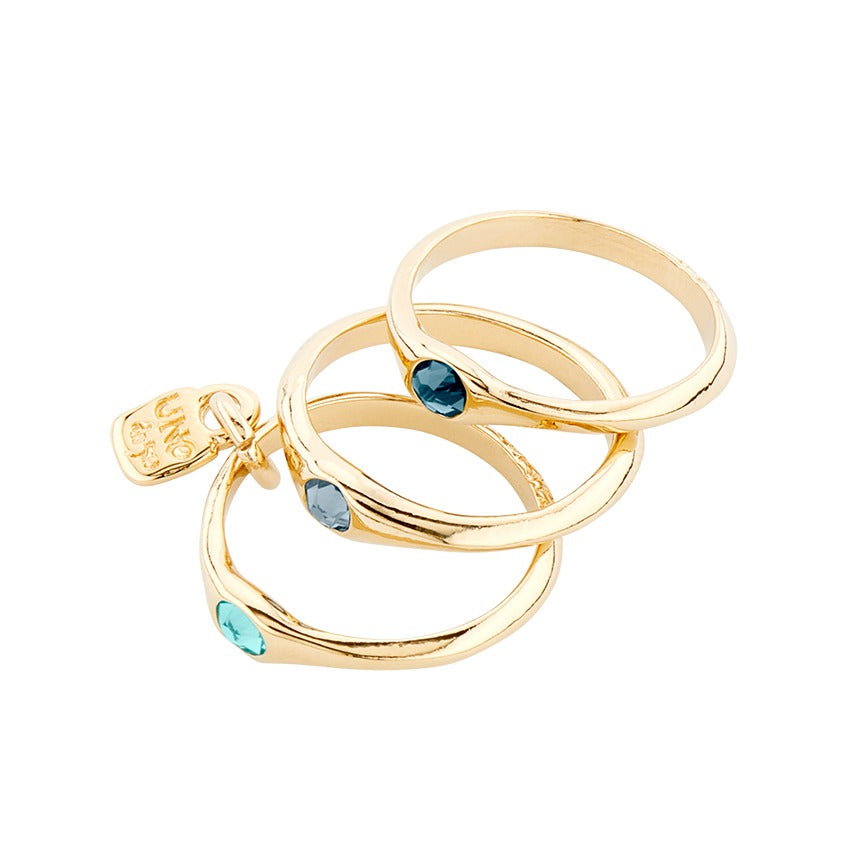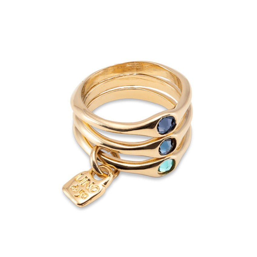 Triple 18K gold-plated ring with three blue Swarovski crystals. A design by UNOde50, handmade in Spain.