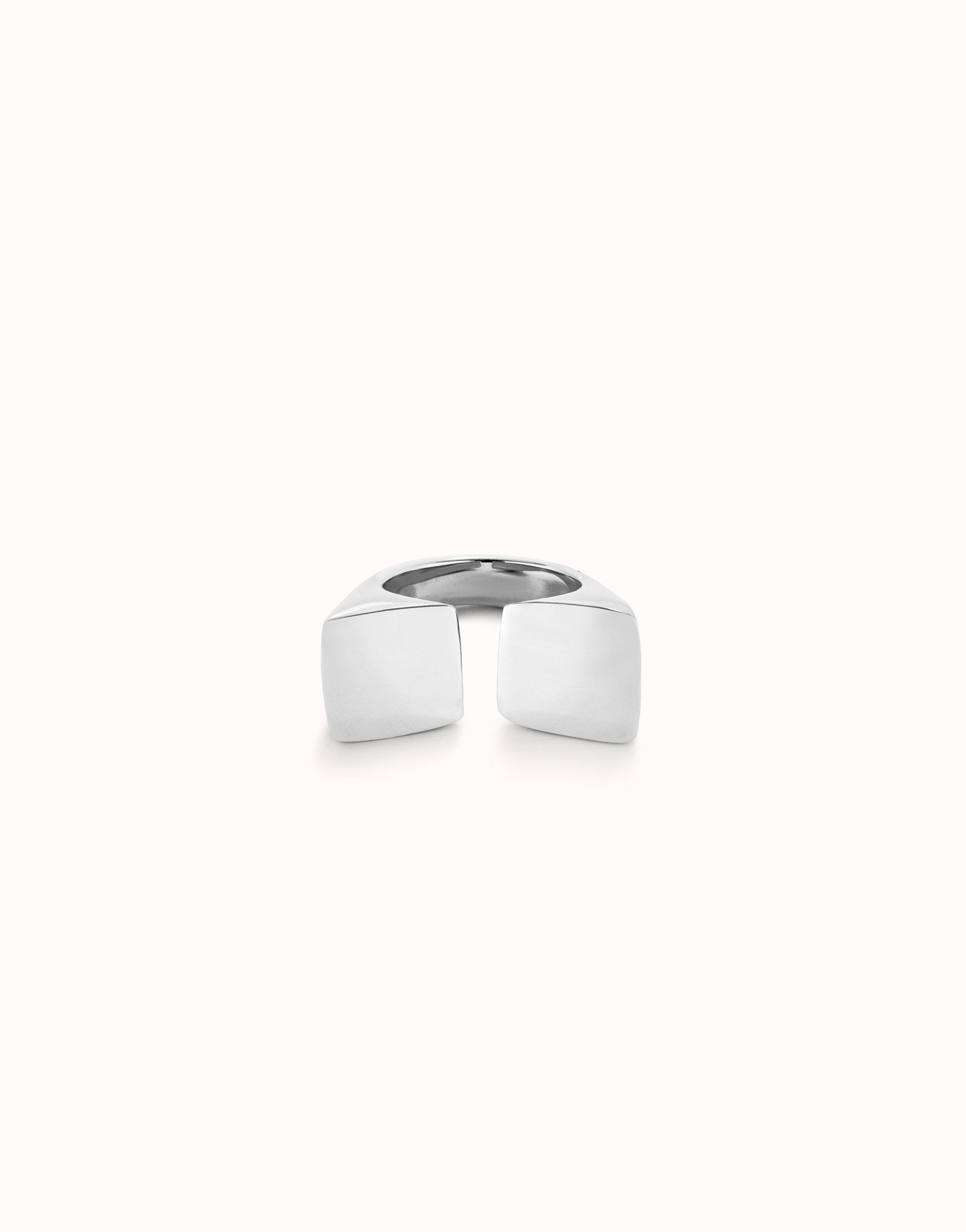 Sterling silver-plated ring. Smooth finish and square shape at the ends. Made in Spain with a 100% handmade process.Jewelry for outspoken people who want to draw attention through the geometric shapes of these pieces. A collection with a clear cubist inspiration brought to the present day. Shapes that decompose and recompose, offering endless possibilities of mix & match between silver or gold-plated and faceted black and white crystals. Discover the collection ser sin complejos.