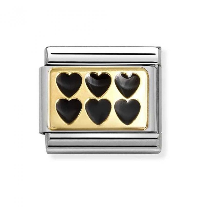 This exquisite charm features an eye-catching design of six black hearts elegantly set against a lustrous gold backdrop. Crafted with premium stainless steel, this iconic charm exudes both sophistication and durability, making it a timeless addition to your Nomination bracelet.