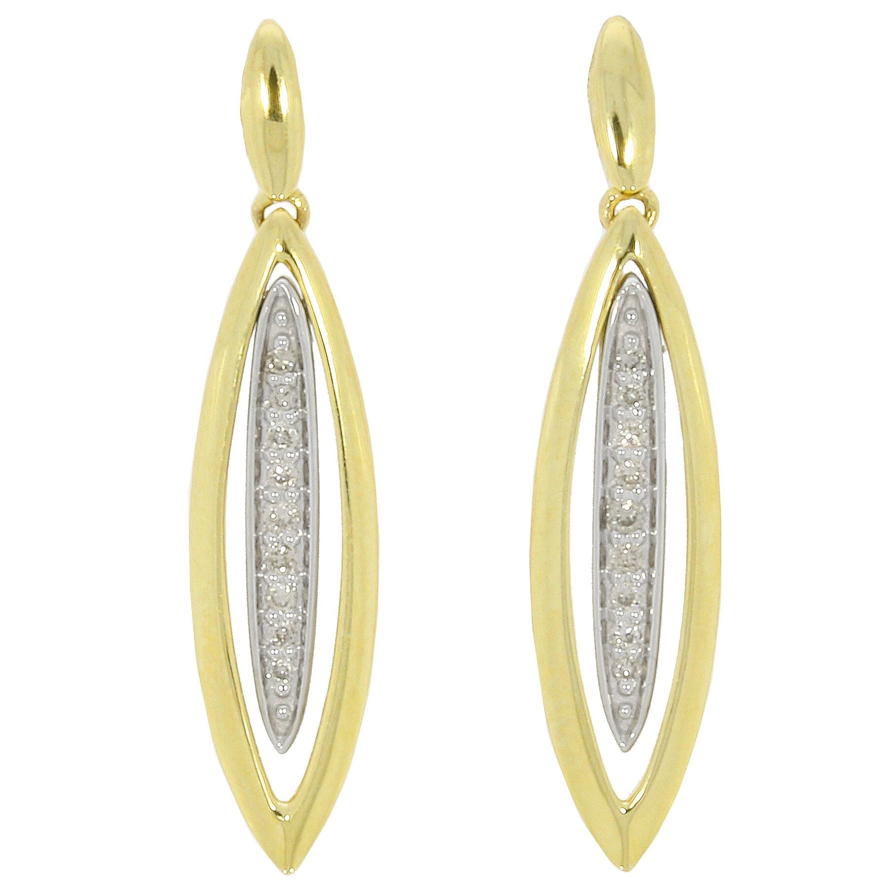 Stunning drop style earrings, featuring a central diamond set 9ct white gold central surrounded by a polished 9ct yellow gold open marquise shape. Finished with post and scroll.